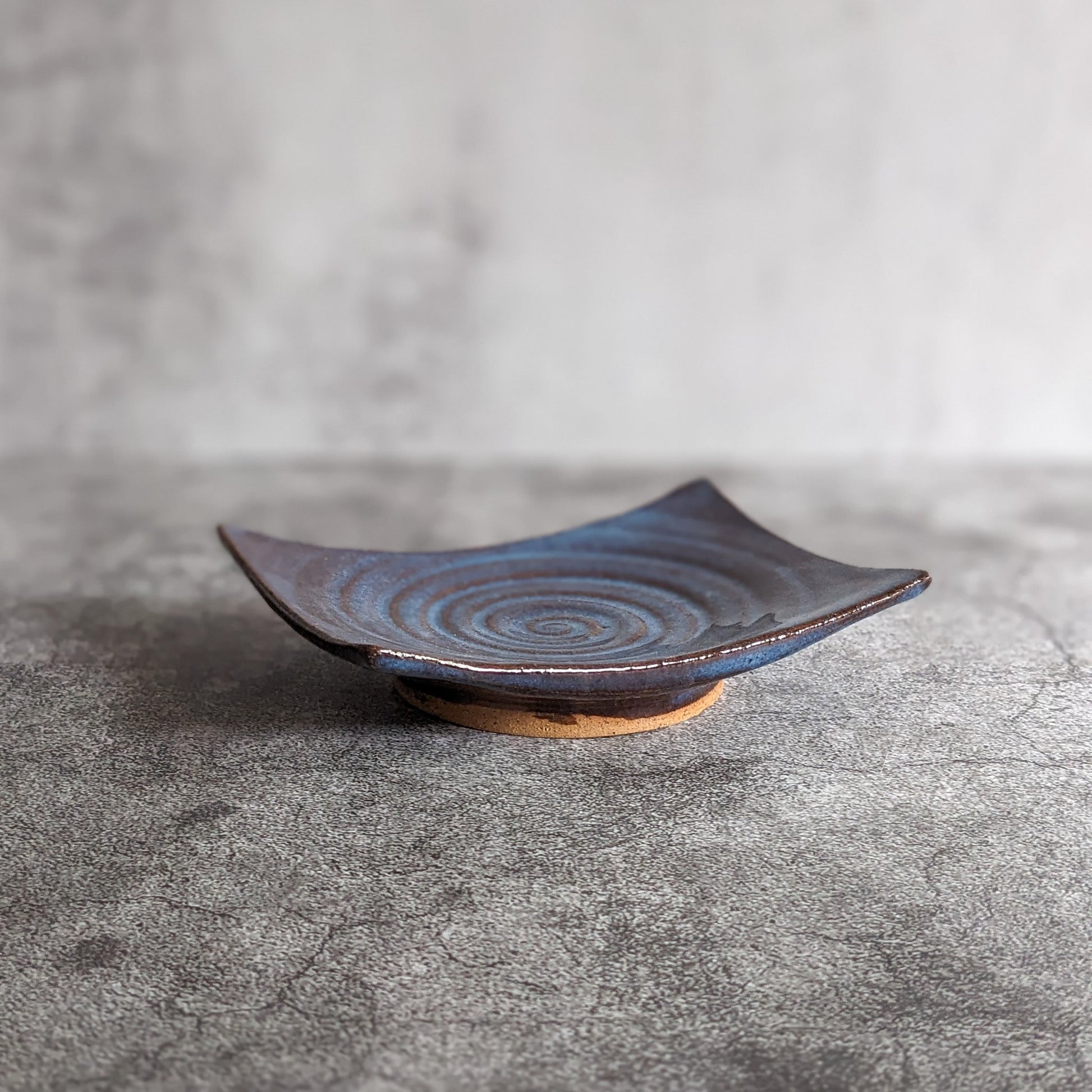 This speckled blue soap dish is carefully wheel-thrown into a sleek rectangular form. Featuring a spiral groove pattern for drainage, combining elegance with functionality in a sophisticated accessory.