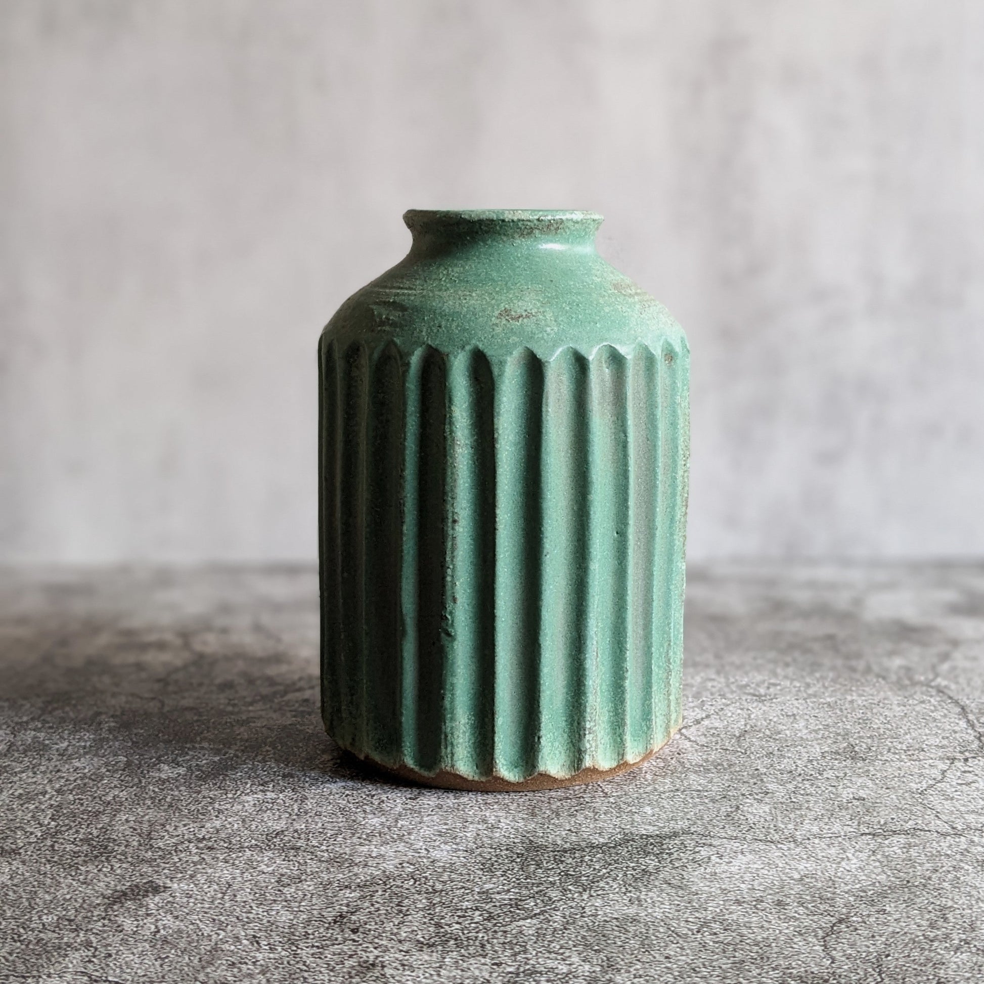 Standing around 5 inches tall, this elegant handmade ceramic vase features delicate fluted details and is finished with a green speckled matte glaze.