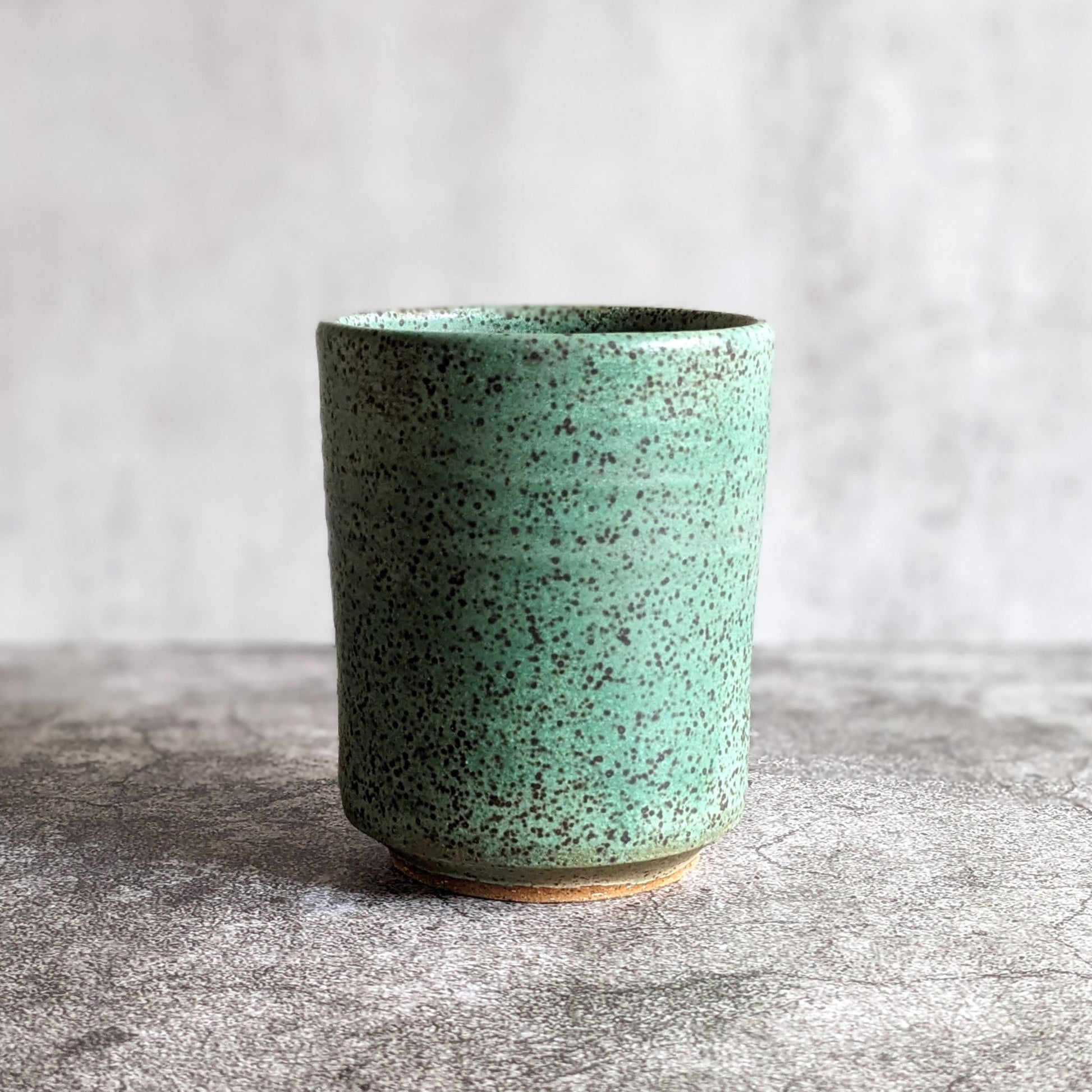 This handcrafted green cup, delicately speckled and wheel-thrown, offers a refined blend of simplicity and style with an 8 to 10-ounce capacity, perfect for enjoying tea or coffee with understated elegance.