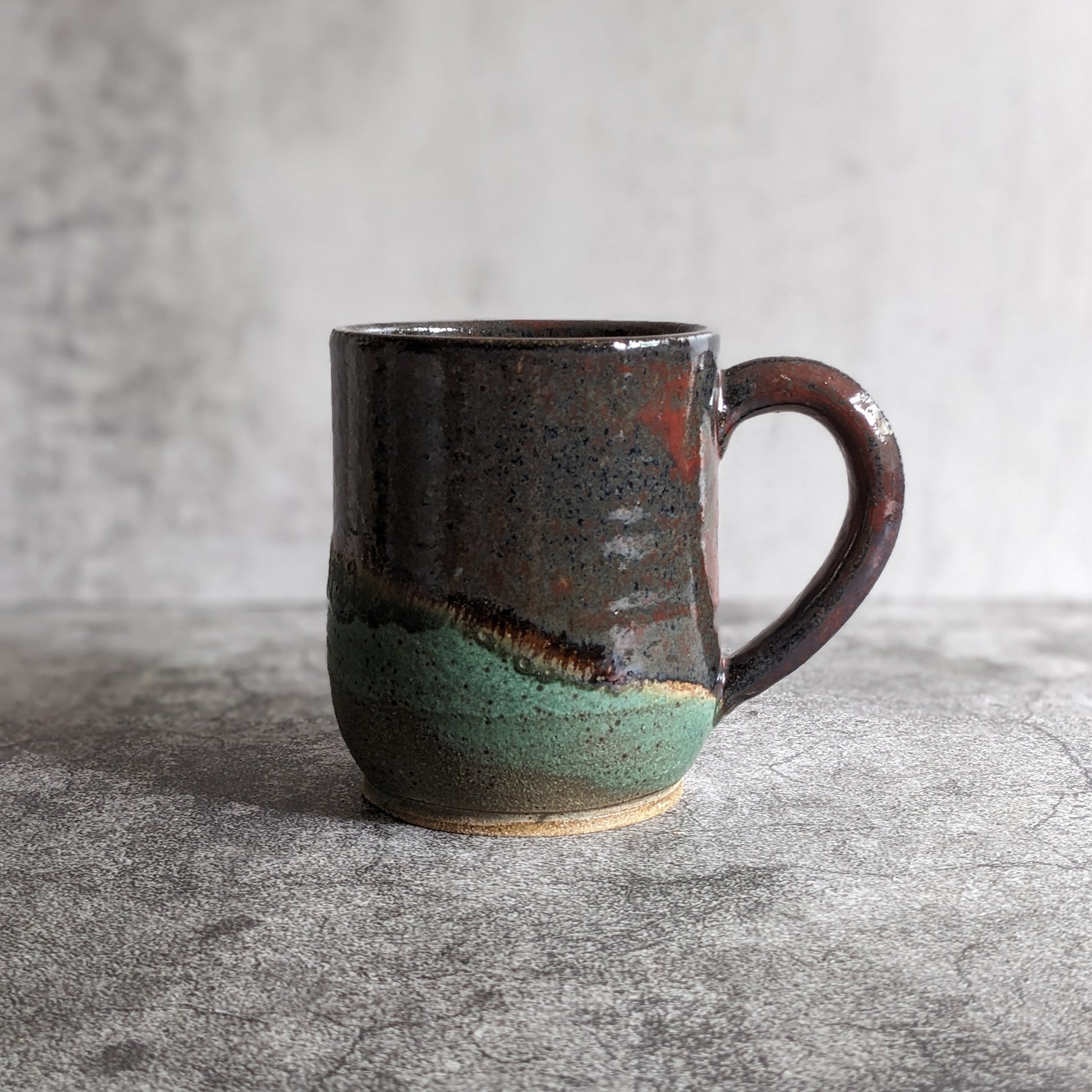 This 4.5" tall handmade ceramic mug features a two-tone design with a copper patina base and a black finish accented by red jasper highlights.